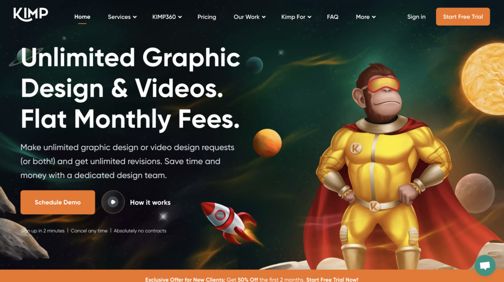 Kimp stands out in the graphic design subscription market with its unique pricing structure. Kimp offers both graphic design and video production in a single, affordable plan. This all-in-one package provides clients with dedicated teams for both, ensuring consistent quality and integrated branding across all projects.