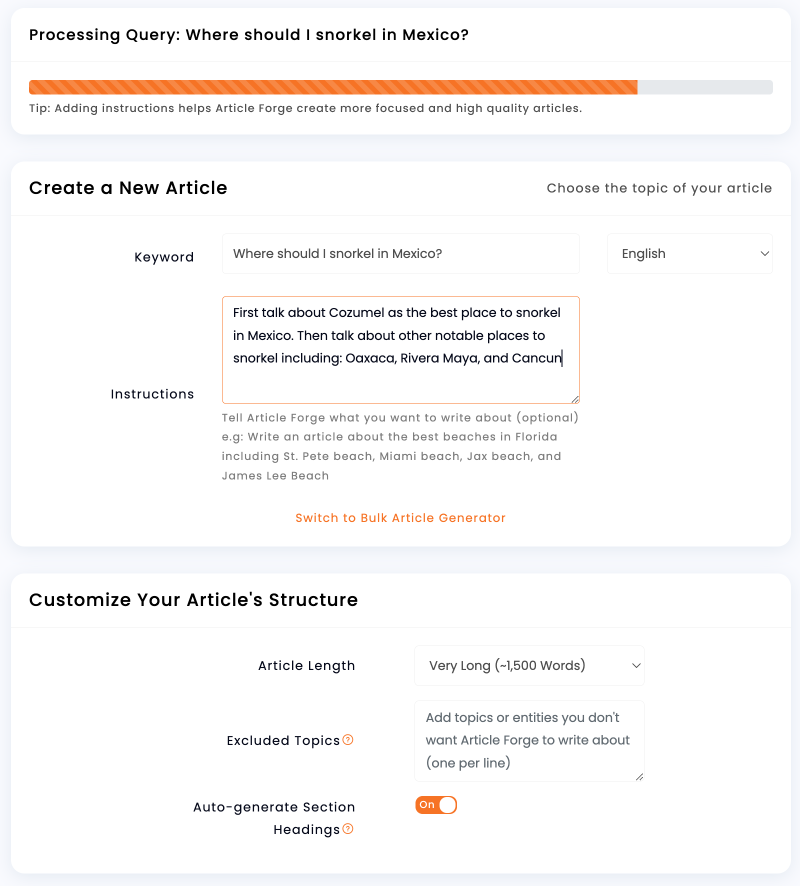 - Content Generation: Whether it's sentences, paragraphs, or entire papers, Article Forge can generate it based on your sample text or topic.