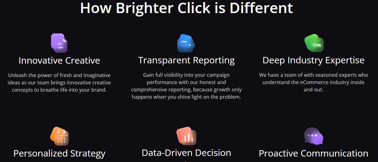 Brighter Click reviews have consistently highlighted our commitment to aligning our marketing solutions with our client's unique needs. This client-centric approach ensures your objectives are met and you thrive in the digital landscape. As your digital ally, Brighter Click is committed to empowering your business with strategic, effective, and measurable online marketing solutions.