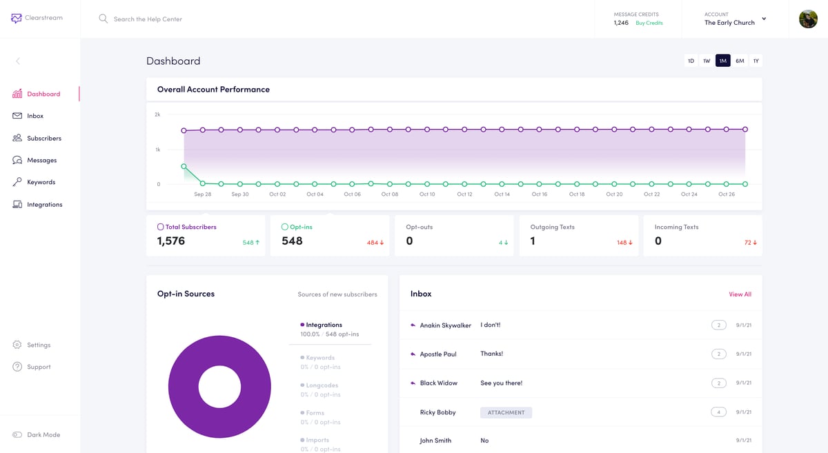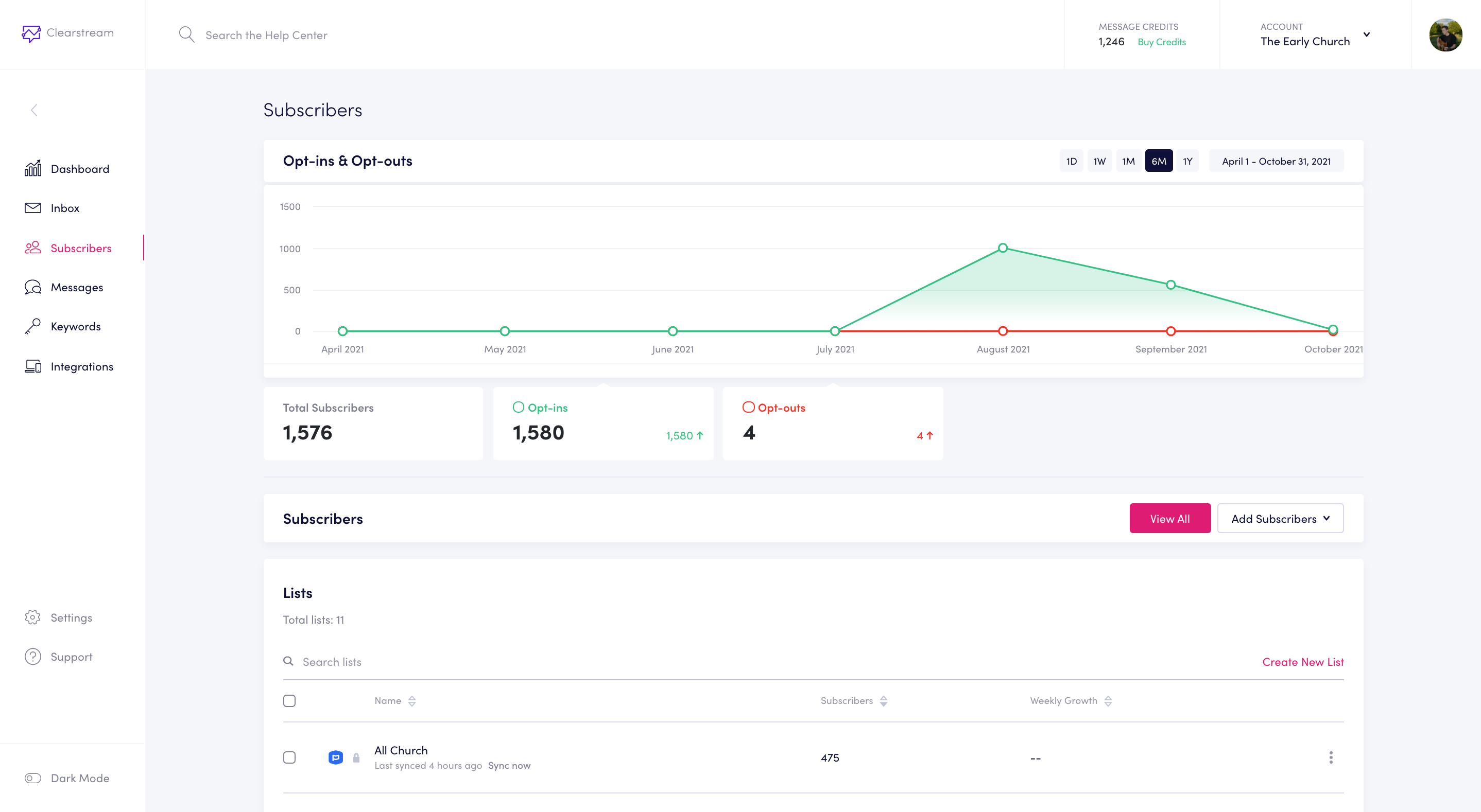 Leveraging Clearstream's services, you can not only mass text your church but also optimize your guest follow-up process with text-to-join keywords and workflows. Our multiple campuses or ministries use Clearstream with Subaccounts feature ensures simplified management. The integration with popular apps and a REST API lets you build SMS into your own applications.