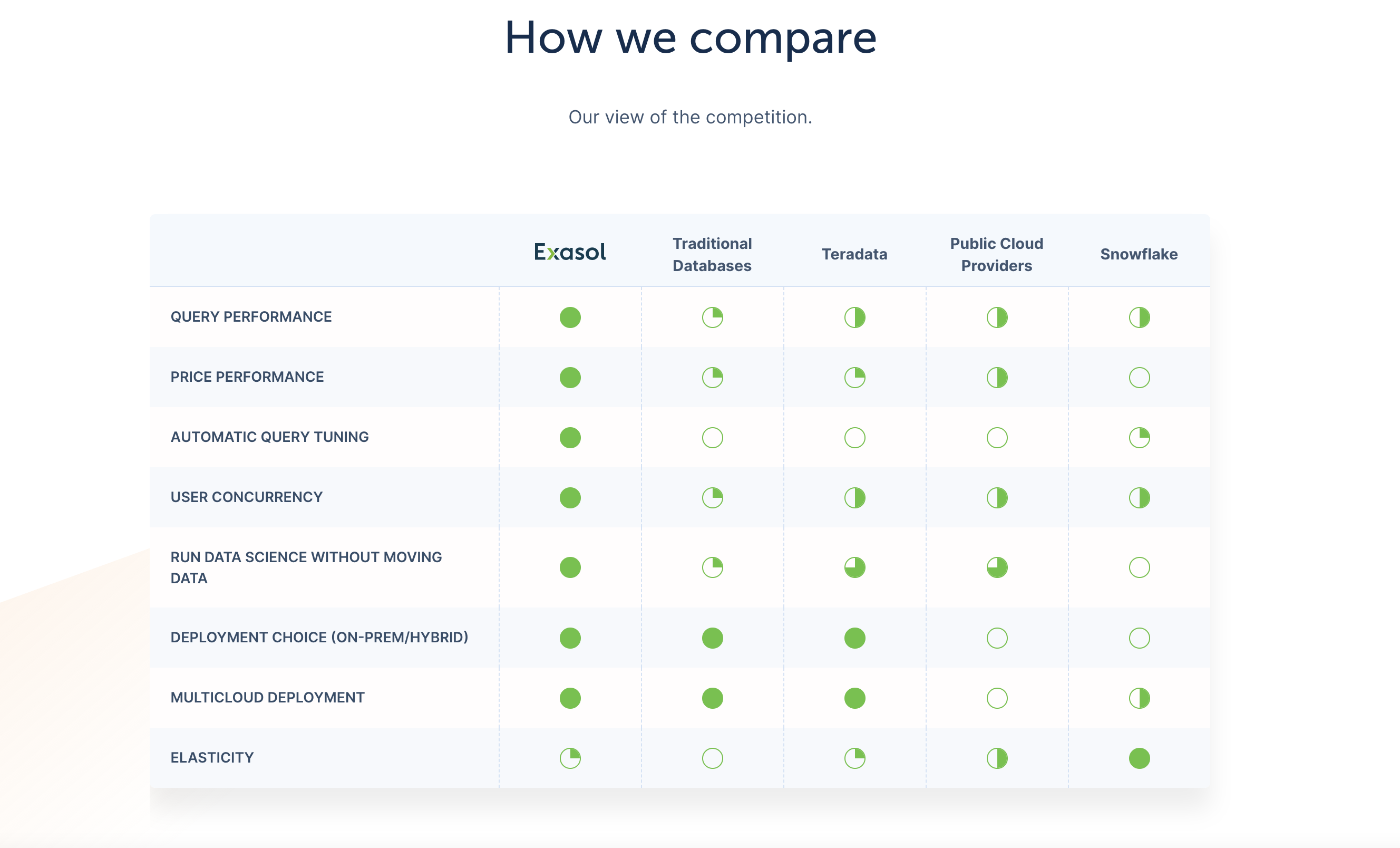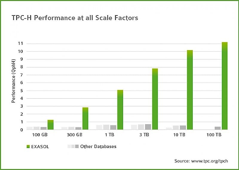 EXASOL's analytics database is unsurpassed, holding the title for the world's fastest as confirmed by the impartial Transaction Processing Council (TPC). But what is it that sets us apart from other popular data warehouse tools out there? It boils down to three unique technical features: