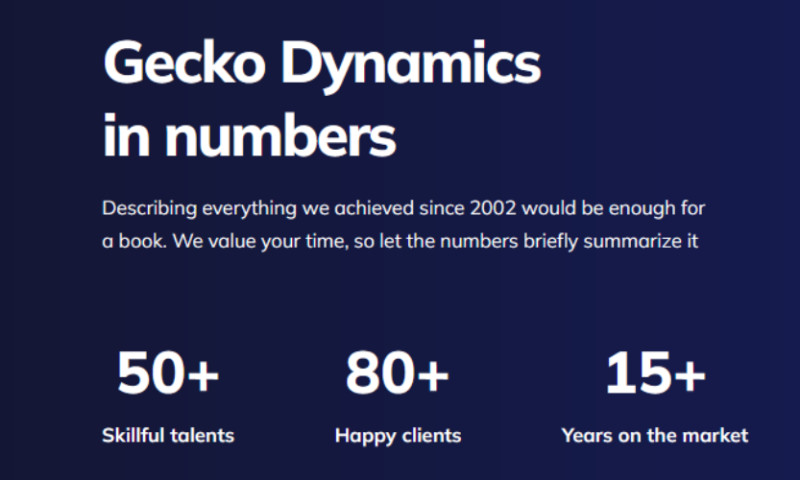 Gecko Dynamics, a leading name among top data analytics companies, has been paving the way in the software industry since 2002. We've explored 27 industries, and our clients represent a rich mosaic of ideas across these sectors. Geography and time zones have never been a barrier for us; our reach spans from Toronto to Melbourne, London to Chicago, Nairobi to Mexico, and beyond. Here's what sets Gecko Dynamics apart: Custom Software Development: We create tailor-made solutions that fit your unique needs, optimizing your business operations. Digital Product Design: Our design philosophy is centered on creating user-friendly and engaging digital products, leading to enhanced user experiences. Web Development: We build robust, scalable, and secure web applications that cater to various industries. Mobile App Development: Our team develops innovative and user-friendly mobile applications that resonate with the target audience. IT Staff Augmentation: Need more hands on deck? We offer IT staff augmentation services that help you scale your team as needed. Big Data Analytics: We leverage data to drive decision-making, helping businesses become more efficient and competitive. IoT: Our IoT solutions help businesses unlock new revenue streams, improve efficiency, and increase customer engagement. Legacy Software Reengineering: We modernize outdated systems and seamlessly integrate new features with existing software. Our expertise extends across Custom Languages, AI, and Software Development, bolstering our standing as a comprehensive software solutions provider. We're more than just a cloud data company; we're a partner invested in your success. Our project management process, which includes Analysis & Scoping Sessions, Prototyping & Specification, Design, Development, Launch, Support and Maintenance, ensures that we are always aligned with your business objectives. Looking for Gecko Dynamics reviews? Our clients can vouch for our commitment towards delivering excellence. Hear about the Gecko Dynamics salary advantage if you consider joining our team. With over 20 years of industry experience, we are ready to take on any challenge. So, whether you're a general data company looking to streamline your processes or a budding startup in need of technical guidance, Gecko Dynamics is the software development partner you can trust. We understand that every business is unique and requires a personalized approach to software development. That's why we offer custom solutions tailored to your specific needs, rather than taking a one-size-fits-all approach. Our team of experienced professionals brings together expertise in various fields including Custom Languages, AI, and Software Development. This diverse skill set allows us to tackle complex projects and find innovative solutions to your business challenges.50 - 99