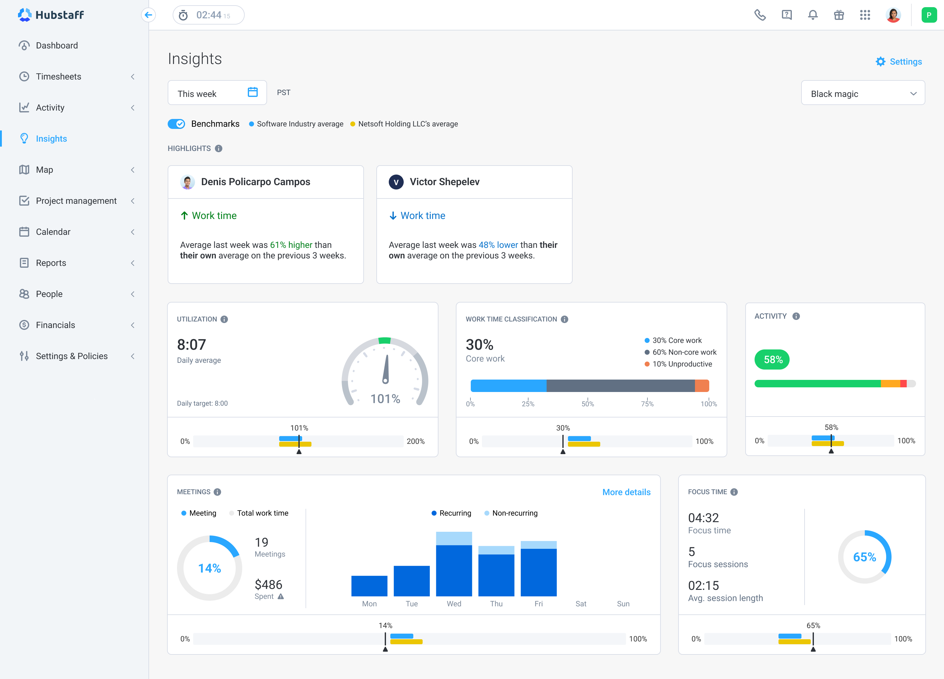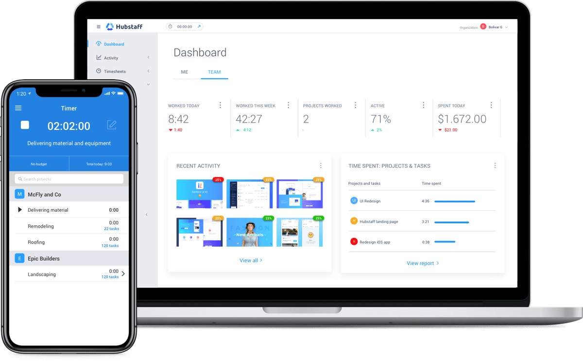 - Time Tracking: With Hubstaff, you can track work hours, set limits, and review detailed timesheets with one simple tool. Think of us as your personal time management tool, helping you keep track of every minute spent on each project and task.