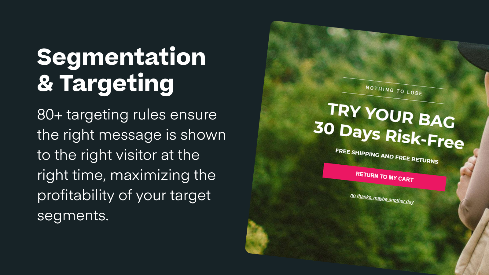 Targeting Analytics: With our advanced targeting rules, you can utilize over 80+ rules including geo-targeting, exit intent, cart contents, traffic source, and more to reach your potential customers.