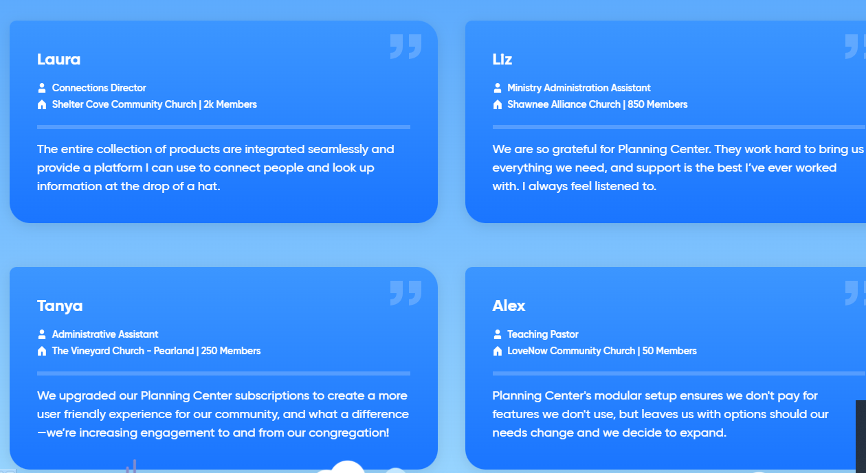 Planning Center is an all-in-one church planning center that is well-equipped to handle the needs of churches of all sizes. We offer flexible planning center pricing, allowing you to only sign up for what you need when you need it. Our planning center services login ensures secure access to our suite of services. We also provide robust planning center support, ensuring your church gets the most out of our software.