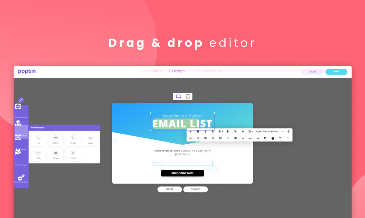You can effortlessly craft website pop-ups and embedded forms with our pre-designed templates and intuitive drag-and-drop editor. Our services feature smart triggers such as exit intent, time delay, scroll, pages visited, and clicks on the page. You can even target specific pages, countries, days, hours, and more to optimize your reach.