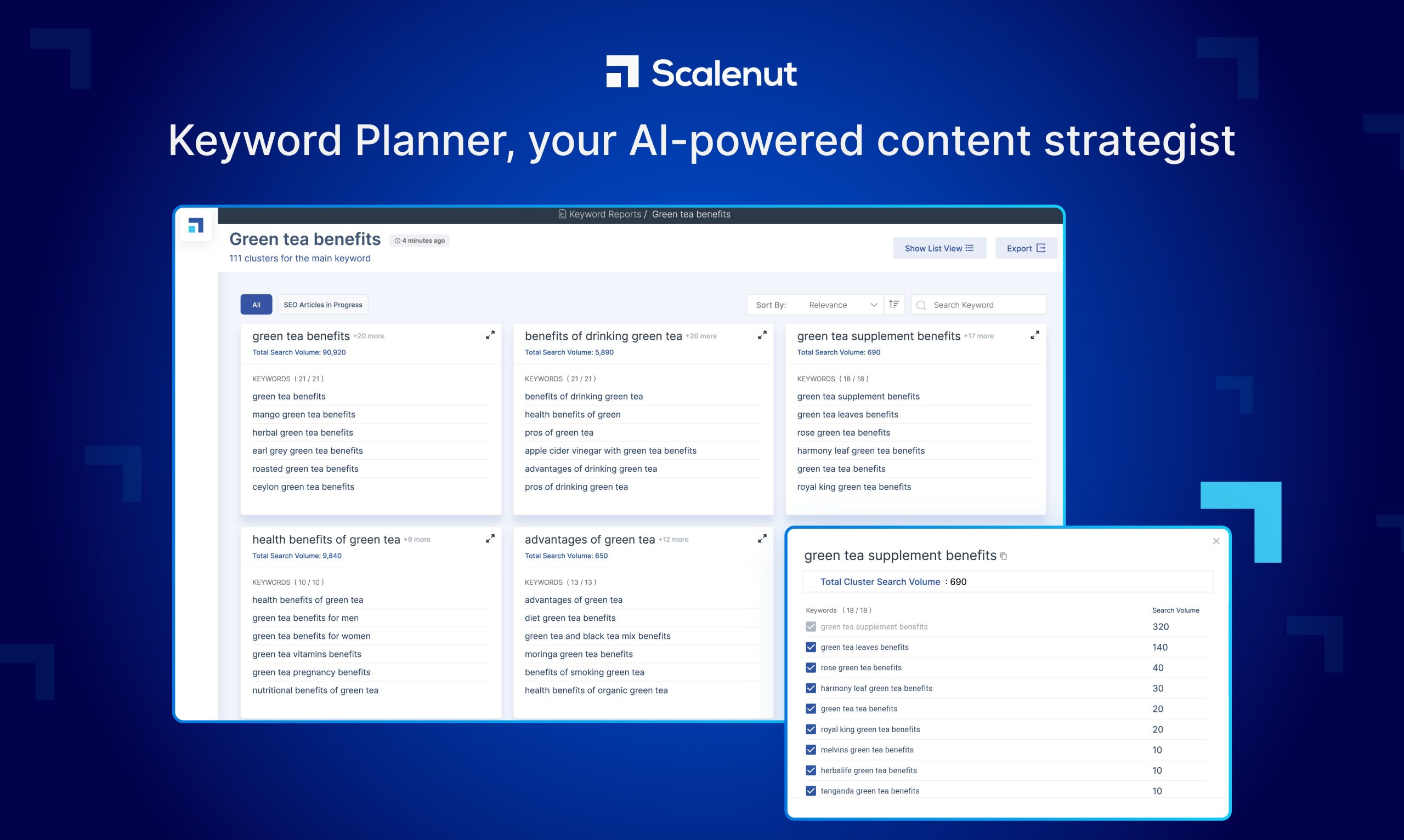 Scalenut is your ultimate solution to content generation and SEO optimization. Powered by advanced AI technology, Scalenut stands tall among the best AI writing software, transforming the way businesses approach their content marketing strategy. Scalenut is not just any AI software for writing; it's a comprehensive platform offering a suite of services that revamps your content marketing landscape. Here's what Scalenut brings to the table:- Keyword Planning: Stay ahead of the game with our intuitive keyword planning tool. Scalenut ensures your content is SEO optimized, attracting more organic traffic to your platform.